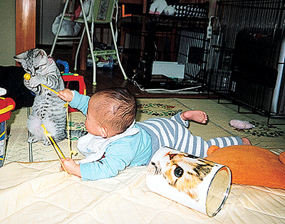 赤ちゃんと子猫のほのぼのとしたシーンをうまく切りとっている作品です。ストロボ光の明暗差により主題が強調されています。かわいい猫と一緒に暮らしている家庭の雰囲気がよく出ています。