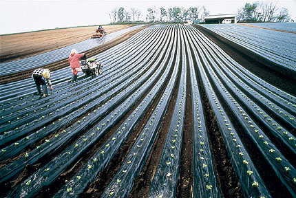 スケールの大きな光景に感動した。造形的な美しさの中に作業する農家の人々の姿が写し込まれている。ビニールに覆われた苗床のレタス一本一本の鮮明さがすてき。広角レンズを巧みに使い、放射線状に伸びた畝をみごとに造形化し、雰囲気のある森と家を入れ込んだ写真のまとめ方がうまい。広大な畑を家族三人で作業している現代農業の光景を巧みにとらえている。