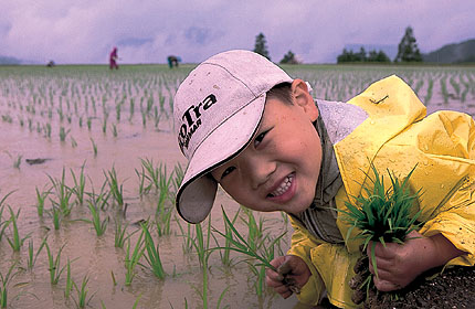 この作品のポイントはこどもの目線の活かし方です。撮影者もカメラを低く構えたことで、こどもと対話しているような感じになっています。また、広角レンズを使い、こどもを手前に配したフレーミングで、天候や田んぼの状況もよくわかります。そして何よりも、田植えを楽しんでいるこどもの表情がうまく表現されています。