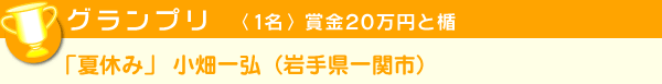 夜に撮影したタングステン光の色彩の写真というのはこれまでの応募作品にはなかったので、とても新鮮に見えました。昼間に撮影した写真と違い、夜ならではのお祭りの雰囲気がよくでています。片側からの光線で、女の子と犬の表情や浴衣が強調されています。タングステン光の持つあたたかさによって、とてもいい感じにの作品に仕上がっています。 |