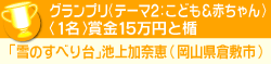 グランプリ寸評:家の前の道を除雪したときにできた小さな雪の山だと思いますが、そこで滑って遊んでいる女の子の逆立った髪の毛と、喜んでいる表情を、シンプルにとても素直に撮っています。脚が画面から飛び出してしまっていますが、それがかえって画面から飛び出して行くかのようなスピード感を感じさせ、なかなか撮れそうで撮れない写真だと思います。 |