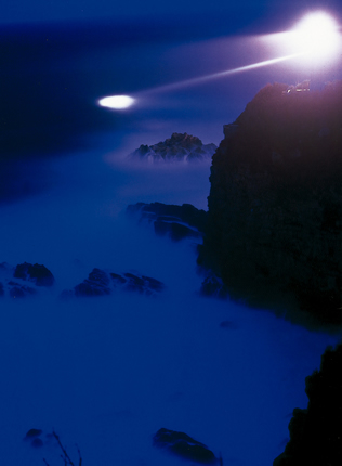 足摺岬灯台の明かりが荒れた海面を照らし出し、長時間露出で捉えられているため、現実とは違った異次元の空間に仕立て上がった。海の白波をブルートーンの幻想的な世界にして、灯台の明かりを妖精に見立てている。写真でなければ表現できない味わいである。光が綾なす自然の美、人工の美が十分描かれていてロマンを誘う。(竹内)