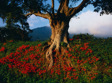 広葉樹の大木の根元にヒガンバナが見事に咲き乱れている。赤と緑の中にしっかりと根を張り、大きく枝を広げた老木の枝振りに力強さがあり、存在感が見事に描写された。大木を境に、右半分が雲に抱かれた背景の山々も面白く、ダイナミックだ。(竹内)