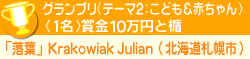 長いレンズを使って背景をボカし、子どもの表情が立体的に浮き出るように撮影されています。背景の処理がとても上手で、光も半逆光なので髪や肌が柔らかく表現されています。右奥に樹を入れることによって奥行きも出ています。そして、小さな手でつかんだ落葉も半逆光できれいに輝いて軽やかな感じになっています。秋の雰囲気が画面いっぱいに感じられる作品です。 |