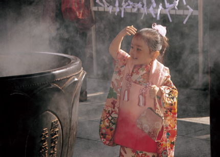 後ろからの半逆光が子供の手先などにきれいにあたり、髪の柔らかい質感や子供らしいフォルムを浮き立たせています。逆光の画面では色が出にくいことがありますが、この作品は逆光がとてもいい雰囲気を出していて、全体が暗い中でお祝いの着物がとても鮮やかです。何よりも子供の表情がとても穏やかで自然に写し出されているのが良いですね。