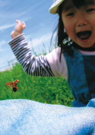 てんとう虫が飛ぶ瞬間、というだけでもすごいのに、お子さんとの一緒の画面になっているので、その驚きの表情とで、驚きがダブルで感じられる作品になっています。しかもこの作品はコンパクトデジタルカメラなので、背景がぼけにくい中で、上手にお子さんとの距離を置いて、上手にぼかして、てんとう虫だけを目立たせるような撮り方をしていたのが勝因です。