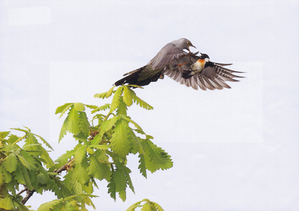 カッコウがノビタキを襲っている写真に見えるんですが、実はノビタキがカッコウに戦いを仕掛けているシーンです。これでノビタキが勝ってカッコウが逃げてくれればいいな思ってしまうような、そういう瞬間をよく捉えたという、作者の鳥に対する愛情が、よく伝わってくる写真です。