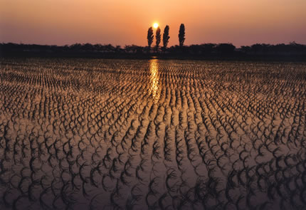 たなびく苗が造形的なパターンを織りなし、美しく詩情豊かな写真だ。普通だと見過ごすようなシーンによく気づき、中央の4本の木がアクセントになっている。夕日をメーンに縦位置で撮るとまとまり過ぎて魅力がない。横位置で撮って広がりを感じさせているところがこの写真の魅力だ。(田沼)