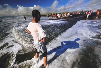 よく見ると地引き網に魚が一杯なので「本当に日本なの」と驚いた。手前に仁王立ちの人物とその影を配し良い構図だ。高い位置から撮影し、奥行きやスケール感がうまく出ている。水平線の傾きが臨場感を出し、夏の日の思い出をうまくとらえている。(三好)