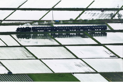 鏡のような田んぼの中に、タイミング良く機関車の姿をとらえている。水面に映り込む車両、たなびく煙、計算したとしても、ここまで要素が調って写るのは難しい。まるでジオラマのように見える点も興味深い。見れば見るほど、その世界に引き込まれてゆく。(三好)