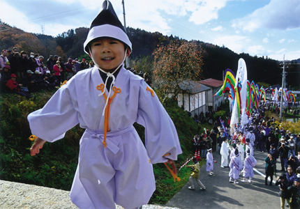 子どもの表情を撮ろうとするとそれだけになりがちですが、この作品は祭りの日の子どもの嬉しい表情を主役に、右には祭りの行列、左には観客がいて、そして真後ろには秋を感じさせる実をつけた柿の木が映しだされて、子どもの嬉しい状況が背景に無駄なく取り入れられています。要素がこれだけ凝縮されているのに背景がうるさくなることなく、子供を生き生きと写し出している素晴らしい作品です。