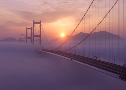 幸運にも巡り合えた夢のようなシーンをバランスのいい幻想的な色調で仕上げている。太陽が真ん中に配置されていることも魅力の一つ。的確な構図で、橋の細部などまでシャープに描写している。(三好)