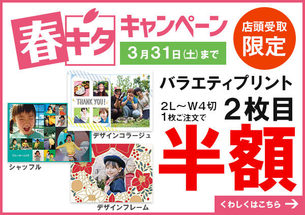 飾り方や選んだ画像次第で楽しさが広がるシャッフルプリントやデザインコラージュプリントも2枚目が半額になります。とりあえず店頭の注文機でデザインをはめ込んでみる!面白さがすぐに伝わると思います!(2枚目半額の対象はデザイン違いも対象。ただし同じ商品同士の組み合わせに限ります。)さらに!対象のフレームは写真プリントやフォトブックとの同時購入で10%オフになるおまけ付き♪「あ、これはプレゼントにぴったりキャンペーンなのか?」「そうそう、そうなんです!」写真は送って喜ばれる!そしてもらって嬉しいもの♪ぜひ、サプライズやイベントの記念に。キタムラをどんどん使ってくださいね♪喜んでもらえる商品、準備しときます!【さらに詳しく!春キタキャンペーンへ】