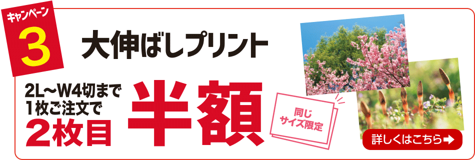 お気に入り写真は大きくしたくなる!大伸ばしプリントもセールの対象です♪作品候補を試しに大きくするもよし、額に入れて飾りたいというご相談も承ります。データで渡すよりも喜んでもらえるかも、お試しあれ!お部屋に飾るのも、いいよね♪