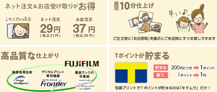店頭受け取りご希望のお客さま限定のサービスになっていますが注文はネットでOK!ご自宅のパソコンや、スマホで注文を済ませて、ご来店いただければ時短にもつながりそうです!お友達とあわせて注文するのもいい買い物ですね。運動会や卒業式のとき、キタムラを思い出してくださいね。写真プリントを一気に注文するならキタムラがお得です。
