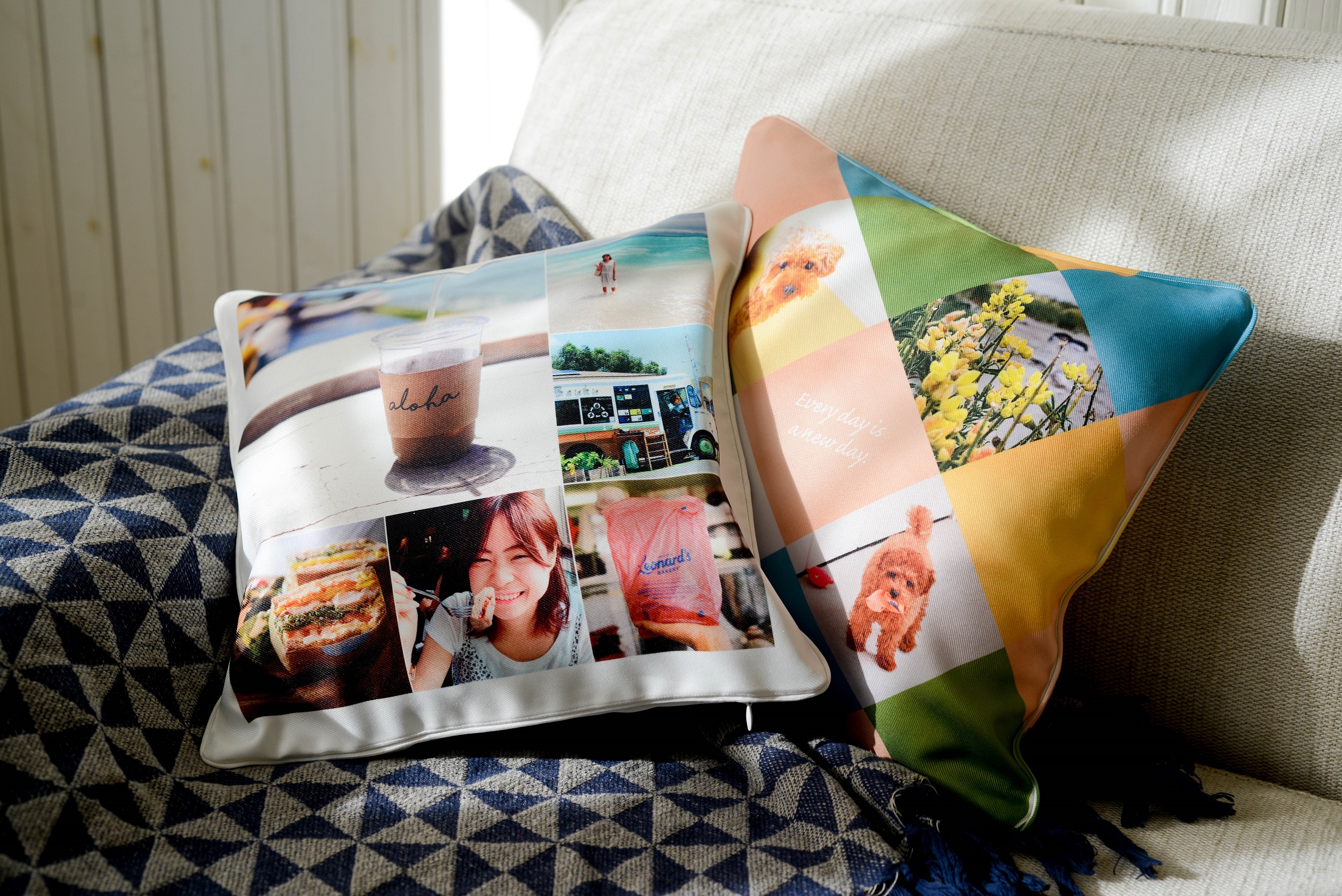 生活空間にいろどりを与えるクッションもリニューアル。9種類のテンプレートから入れたい画像の枚数に応じて選択できます。ディスプレイ的な使い方のほかに、両面印刷が出来るので、表裏を使い分けた楽しいクッション作りもできます(もちろん片面もできます)。自由度が高まったリニューアル。ご検討いただける機会も増えそうです。