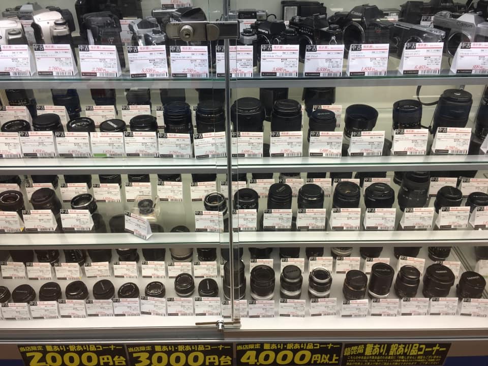 今の品揃えで言うとフィルムカメラ、レンズの在庫量は個性だといえるとおもいます。それと低価格帯の難あり品。はっきり言って故障しているものも多々あるのですがそういうアイテムを細かに状態記載して販売しているのは日本橋らしいと思います。詳しいスタッフさんがいてこその業に見えますなぁ・・・