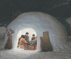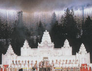 また、「絹の園・優雅の舞い」と銘打って高さ15m 、幅35m 、奥行25m の雪像舞台は、き ものデザイナーが日本絵巻をイメージした和風調の舞台です。さらに近隣には数え切れないほどの雪だるま、地元では「ほんやら洞」と呼ばれているカマクラが立ち並びます。