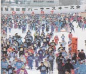 歩くスキーは時間との競争もなく、あくまでもマイペースを主体にしてお祭り気分で参加できます。この歩くスキーの愛好者も増えて、選手は約10,000人ほどにもなり、日本有数のクロスカントリーですが、周囲の景色を眺めながら丘陵をゆっくりとワイワイガヤガヤしながら、家族や友人と走るでもなし、歩くでもなし、途中でひと休みしたりで、本格的な傾斜のあるゲレンデスキーとはまた異なった楽しそうな顔が並びます。