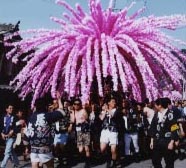 ともあれ、美濃まつりは八幡神社の伝統ある祭礼で、行事を大きく分けると、土曜日が主体の花みこし、日曜日のメインになる山車、そして土・日曜日にかけての夜に行われる流しにわか(仁輪加)になります。花みこしは、桃色に染めた紙の花を“しない”に飾ったみこしが町を練り歩きます。“しない”といっても剣道の竹刀ではなく、柳の枝がしなっているような感じで、そのしないを1基のみこしに200本以上飾り付け、30基ほどが出陣しますから絵になります。また、山車は練り物を従えての行列となります。