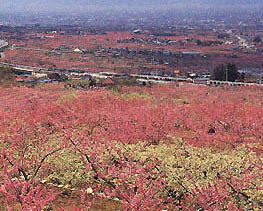桃の産地は全国各地にありますが、生産量が多いのは山梨県で、ぶどうと並んで名産になっています。周囲を高い山に囲まれた甲府は、盆地特有の冬が寒く、夏が暑い気候によって、桃、ぶどうだけでなく、果樹の栽培には適しているといわれています。ここ甲府盆地ではとくに一宮町、石和町、御坂町といった地域では桃の栽培が盛んに行われています。