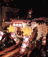 七夕の飾り上に乗せた山車を勇壮にぶつけ合うことから「喧嘩七夕」と呼ばれているようです。七夕はどちらかといえばロマチックな行事ですが、そこに喧嘩を持ち込んだアンバランスさが何かおもしろさを感じさせてくれます。豪華な装飾した山車と山車がぶつかり合う、闘争がどこから生まれてくるのでしょうか。夕やみが迫り出すと、祭りのクライマックスが訪れます。