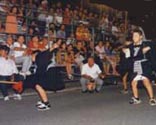 ところで、この大名行列の特徴は、10才前後の子供が大名になります。小道具(立傘、草履、槍、鋏箱など)を子供が振り、大道具(大唐人傘、天目槍、大鳥毛槍など)は大人が振って歩きます。傘持ちは「コラッサ」の掛け声で、上に投げては下で受け取ったり、頭上にかかげたり、首の回りを回転させたりが見ものです。この掛け声も種々に異なりますが、一糸乱れずに練り進みます。