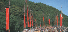 神事は3日間にわたるようですが、本祭りが20日になり、中島地区の大きな4つの神社が一斉に同じ祭りを行います。それぞれの神社へ末社から、高さ20~23メートルもの真紅の枠旗(わくばた)を持って「イヤサカサー」の掛け声とともに参集して来ます。久麻加夫都阿良加志比古神社の末社が19社あって、もつとも多くが参集します。10時頃から神社へ枠旗をかついだり、鉦、太鼓、神輿などが参集したあと、加茂原で昼過ぎから4時頃まで練って歩きます。撮影ポイントはいくつかありますが、やはり加茂原に参集した時がメインになるでしょう。