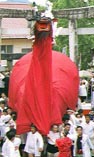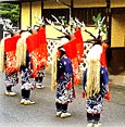 ところで、秋祭りのメインは牛鬼と八ツ鹿(やつしか)です。牛鬼は宇和島地方での祭にはつきもので、春、夏の祭にも登場します。その名の通り恐ろしい鬼面ですが、この恐ろしさを持って「悪魔ばらい」をさせようというのですから、宇和島の人達は昔から、ユーモアがあったようです。これに対して八ツ鹿は8人の少年によって優美に舞われます。赤い布で覆い、一匹の雌鹿を七匹の雄鹿が探し求め、見つけ出して喜び合う物語です。胸の太鼓をトコトン、トコトンと打ちながら舞う姿は叙情詩的で、是非、カメラに納めたい被写体です。