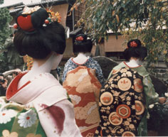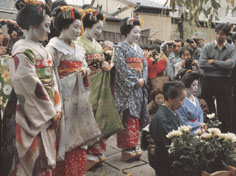 またカメラマンにとっても、恰好の被写体になります。献花は11時前後(祭としては午前11時から午後2時)からですが、午前9時頃にはカメラマンの場所選びが始まります。撮影ポイントとしては、巽橋付近の混雑を避けて、花見小路、祇園新橋がいいでしょう。夜の祇園は格別ですが、昼の風情もまたいいものです。
