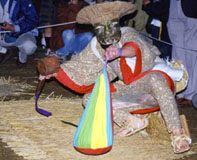 松明に囲まれた中で、七福神が登場してきます。剣と縄を持った不動明王が登場して、禰宜との問答が始まります。「さんそうろう、某は滝に住む大聖不動明王とはわがことである。神楽があると聞き、氏子に福を授けんと思い参って候」と、登場理由を述べ、おもしろおかしく、見物人を笑わせてくれます。七福神の恵比寿様が、例の釣り竿を持って舞いだすと、毘沙門天、大黒天ら順次、現れて五穀豊穣、福徳長久を与えてくれるというものです。