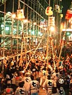 夜間に灯をかかげての祭ですから、カメラマンにとっては絵になります。但し、薄暗い所で、動きが活発なために撮影は意外と難しいのです。フィルムは、ISO 感度100 ではブレブレの写真になってしまいます。感度400 以上のフィルムで光量の大きなストロボを使いたいところです。リバーサルフィルムでの撮影では、オーバー露出にならないように注意してください。ストロボを使用してのオーバーな写真は見られたものではありません。