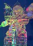 30数体の氷の彫刻が並んで昼間もきれいですが、夜間にさまざまな照明に映える、氷と光の芸術にみとれることでしょう。夜間のライトアップでの撮影は、ノンストロボで挑戦してみたいところです。氷像に異なったカラーライトを多方向から当てますので、見方、角度によって変幻万化し、撮影ではその色の選択がポイントになりそうです。