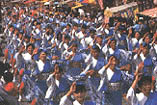 それはともかくとして、牛深ハイヤ節は「牛深三度行きゃ三度裸」の囃子に乗っての民謡で、最近ではビートの効いたリズムとしてヤングにも人気が高く、全国的な広がりをみせています。祭には遠方からの団体参加もあって、ここ数年は70団体、約 5,000名が踊りに参加するといわれています。徳島の阿波踊りのように、全国規模の様相もあります。
