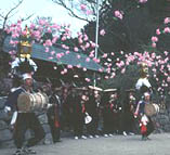 祭礼の当日は、9時から式典があって、太鼓踊りは10時から始まりますが、4か所の字が交互に神社の門などで舞います。午後5時5分まで舞いますから、撮影時間はタップリあります。頭に花飾りを付けての踊りですから、やはり背景には気を付けて、ゴチャゴチャした写真にならないように配慮するとよいでしょう。