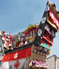 この「デカ山」は神輿のようにスピードはありませんが、それでも山のような重さ20トンが動くのですから危険です。昔はもっと大きく轢かれてケガ人もでたそうで「地獄車」と呼ばれていたこともあったそうです。多分、かなりの速度で走ったのではないかと想像されますが、特に狭い道を通る時は、注意するのに越したことはありません。道行での撮影場所としては、やはり狭い路地を曲がる時ですが、ここでの撮影は前もってロケを行って、撮影場所を見極めておいた方が無難です。