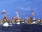 この三宮はほぼ一線上に結ばれていますが、みあれ祭は、中津宮の大島港に宗像七浦から集まった約 500隻の漁船が、辺津宮のある玄海町神湊(こうのみなと)まで、大船団を組んで玄界灘を渡御する海上御神幸祭です。