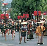 参勤交代の半数以上は、この箱根街道を利用しなければならなかったと言われていますから、当時の箱根の賑いは大変なものだったことがうかがえます。その往時を偲んで、毛槍を振った露払いの「下ニィ、下ニィー」の掛け声を先頭に行列が進みます。その行列には大名かご、腰元、奥女中、鉄砲隊などに続いて、湯本の芸妓連 200名による華やかな手踊りバレードも演じられます。湯本の温泉街6キロメートルを5時間半ほどかけてひと回りし、15時30分頃に終了します。