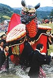 1時30分過ぎから、砥崎(とさき)の河原で演舞が行われますが、ユーモラスな撮影をしたいのであれば、八代ではガメの愛称でしられる、タタミ4畳分ほどの「亀蛇(きだ)」がお薦めです。亀と蛇が合体した想像上の動物で、他の祭では見られない形とユニークな動きがあります。