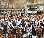 14日、午前10時10分、討ち入り装束に身を固めた人たちが、毘沙門堂を出発。四十七士の遺髪塚がある瑞光院で、参拝を済ませた代表者らと合流。また、行進は11時頃、JR山科駅で子供義士隊と合流します。ここでは婦人による舞踊列踊りが披露(このほか西友山科店、大石神社などでも披露)されます。山科駅前から区役所まで練り歩いたあと、バス移動で、岩屋寺を経て大石神社(写真)へ。約5Kmの行進を終え、一斉に「エイ、エイ、オー」のかちどきをあげ、午後3時頃に解散となります。