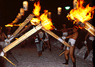 祭りは午後3時に始まり、深夜にまで及びます。寺院では、4時に献膳式、6時に初夜作法、7時に後夜作法と続きます。一方、平泉駅前に集合していた、厄年の人達、約 300人がたいまつを持って、行列(献膳行列=蘇民祭)を組み、8時前後到着し、仏前に大根や白菜などの野菜をささげて、無病息災・ 家内安全を祈願します。中には下帯ひとつの裸の人達もいます。そして9時から延年の舞が奉納されます。