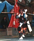 ともあれ、古式豊かなこの奉納行事は、各地区で朝から始まり、能楽は御田八幡宮で午後1時ぐらいから演じられます。能楽は神事ですから、撮影は社殿に上がらないようにの制約があります。拝殿およびその付近からの撮影になります。「ストロボはなるべく使用しないでください」と言っておられましたので、禁止と考えて、ISO 400 以上の感度の高いフィルムで撮りたいものです。