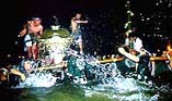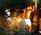この祭での撮影ポイントは、やはり、ほかでは撮れない「走り込み」です。仕掛け花火をバックにして、若い衆が神輿を担ぎ横堀川へ入り、川の中に立てられた竹筒の頂上にあるお札の争奪戦が始まります。3体の神輿が午後9時前後に飛び込みますが、竹筒があるのは、川岸から15メートル前後あります。争奪戦を撮るにはフィルムの感度にもよりますが、ストロボのガイドナンバー32以上ほしいところです。地元カメラマンによりますと「スネまでに水に浸かるぐらいの意気込みで撮らないと、迫力ある写真は得られない」そうです。