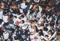 静かな尾鷲周辺が、2月1~5日の5日間は、ヤーヤ祭がその静けさを破ります。夜、神社や町の通りで白装束の男たちが「チョウサじゃ」のかけ声とともに、20の各町から約600人がケンカのように激しくぶつかりあい、往時の迫力と熱気を今に伝えています。以前はフンドシ1枚の裸だったそうですが、時代とともに白装束を身にまとうようになったとのことです。