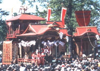 4月13日 午前10時八幡宮から御旅所まで神輿渡御。午後1時八幡宮に参集して、くじ取り式。出番の各組町内で子供歌舞伎。