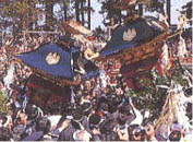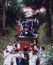 白山神社から2基のみこしを担ぎ出し、急な階段を下り、日光寺境内へ渡御します。この2基が、掛け声とともにぶつかり合います。