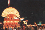 この献灯まきわらは、以前は堀川に舟を浮かべていましたが、現在は、西門と東門の駐車場で、5基が幽玄な世界をかもしだしてくれます。花火は、神宮から少し離れた神宮公園で行われます。