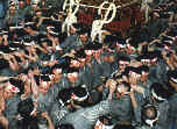 100を越える高張り提灯や手丸提灯に先導された神輿が神社の大鳥居前に来ますと、台輪が四尺三寸もある胴の太い壱千貫ものお化け神輿が揉まれます。神社前の蔵前橋通りは、10万人近くの人出に埋まります。