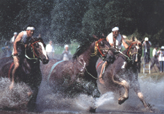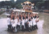 ところが、ここの御田祭は、行列の出発時に神輿を放り投げたり、田の中に神輿、牛や馬を入れ、泥しぶきをあげて駆けずり回ります。また、子供も手製の神輿で田の中を練り歩きます。