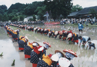こうした大賑わいのあと、雅楽に合わせて、揃いのかすり、揃いの笠をかぶった早乙女達の華やかなお田植えが始まります。地元では「おんださん」と、呼ばれる村の最大の祭です。